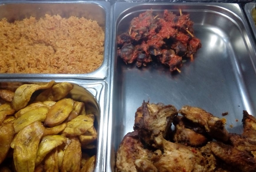 Staple Nigerian dishes like jollof rice, fried rice, egusi or Calabar soups, ofada rice with turkey or beef, yam pottage, efo riro and dodo-gizzard.